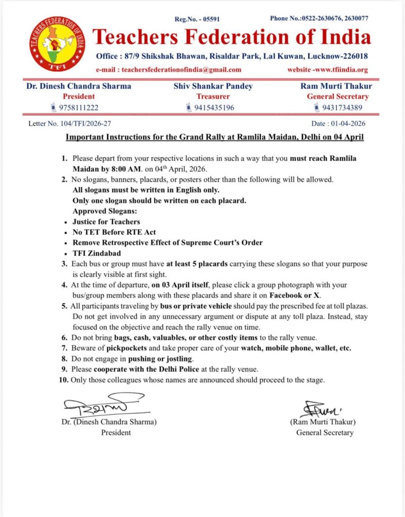 टीईटी अनिवार्यता के खिलाफ बड़ी रैली का हुआ आयोजन टीचर्स फेडरेशन ऑफ इंडिया ने कहा केंद्र सरकार सुप्रीम कोर्ट के आदेश को खत्म करने लिए कानून बनाए