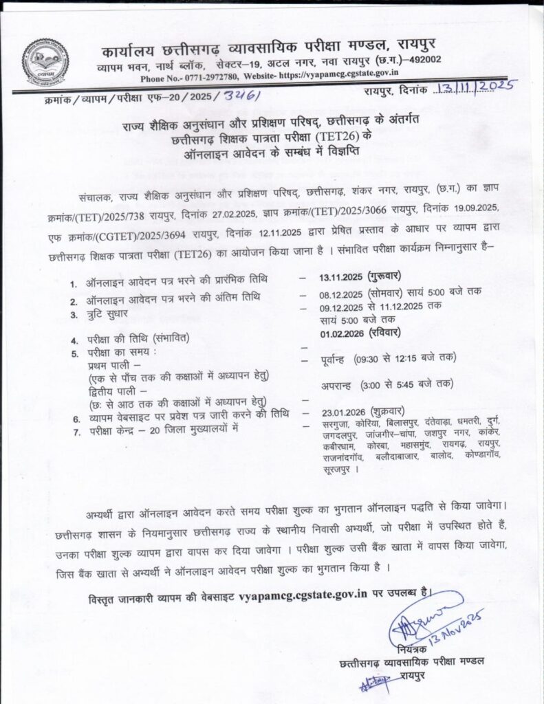 संचालक, राज्य शैक्षिक अनुसंधान और प्रशिक्षण परिषद्, छत्तीसगढ़, शंकर नगर, रायपुर, (छ.ग.) का ज्ञाप क्रमांक /(TET)/2025/738 रायपुर, दिनांक 27.02.2025, ज्ञाप क्रमांक /(TET)/2025/3066 रायपुर, दिनांक 19.09.2025. एफ क्रमांक (CGTET)/2025/3694 रायपुर, दिनांक 12.11.2025 द्वारा प्रेषित प्रस्ताव के आधार पर व्यापम द्वारा छत्तीसगढ़ शिक्षक पात्रता परीक्षा (TET26) का आयोजन किया जाना है। संभावित परीक्षा कार्यक्रम निम्नानुसार है-
