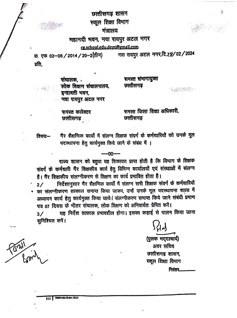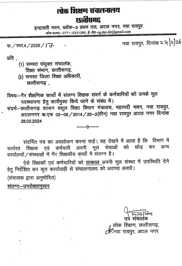क./स्था.4/2026/17 नवा रायपुर, दिनांक 24/2/26 के द्वारा जारी आदेश में समस्त संयुक्त संचालक, शिक्षा संभाग, छत्तीसगढ़ समस्त जिला शिक्षा अधिकारी, छत्तीसगढ़.को संबोधित करते हुए निर्देशित किया गया है कि गैर शैक्षणिक कार्यों में संलग्न शिक्षक संवर्ग के कर्मचारियों को उनके मूल पदस्थापना हेतु कार्यमुक्त किया जाकर संचनालय को अगवत कराया जाए।