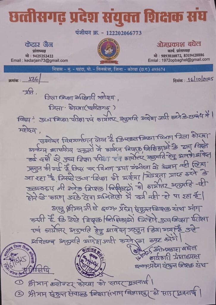 छत्तीसगढ़ प्रदेश संयुक्त शिक्षक संघ के कार्यकारी प्रदेश अध्यक्ष ओमप्रकाश बघेल एवं छत्तीसगढ़ शिक्षक संघ बिलासपुर के संभागीय अध्यक्ष डॉक्टर तरुण सिंह राठौड़ द्वारा संयुक्त रूप से कहा गया कि जिला शिक्षा अधिकारी कोरबा द्वारा शिक्षकों को उच्च शिक्षा की योग्यता से बंचित किया जाना एवं परीक्षा एवं कार्योत्तर अनुमति आदेश जारी नही करना शिक्षकों का उच्च शिक्षा प्राप्त करने के मूल अधिकारों का हनन है। संघ द्वारा मांग की गई है कि ऐसे मामलों पर स्कूल शिक्षा विभाग को गंभीरता से संज्ञान लेकर प्रभावित शिक्षकों को अविलंब उच्च शिक्षा परीक्षा एवं कार्योत्तर अनुमति आदेश जारी करना चाहिए।ताकि प्रभावित शिक्षकों को समय रहते उसका लाभ मिल सके।यदि उक्त मामले मे विभाग द्वारा समाधान कारक अविलम्ब पहल नही हुई तो संघ उच्च स्तर पर शिकायत पत्र प्रेषित करने बाध्य होगा।