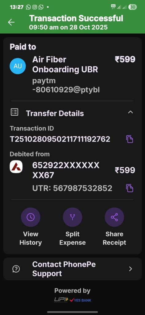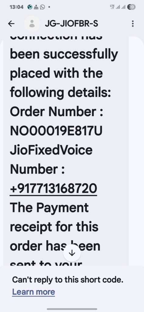 एक उपभोक्ता ने बताया कि उन्होंने जिओ नेटवर्क के कुशल देवांगन नाम के कंपनी के प्रतिनिधि के तौर पर ऑनलाइन उनके बताए फोन पे लिंक पर किया जो कि जिओ का ही था । बाद में थोड़ी देर बाद कन्फर्मेशन मैसेज भी आया , जिसमें सफलता पूर्वक जिओ एयर फाइबर कनेक्शन की बुकिंग प्रकिया पूर्ण हो गई थी।
