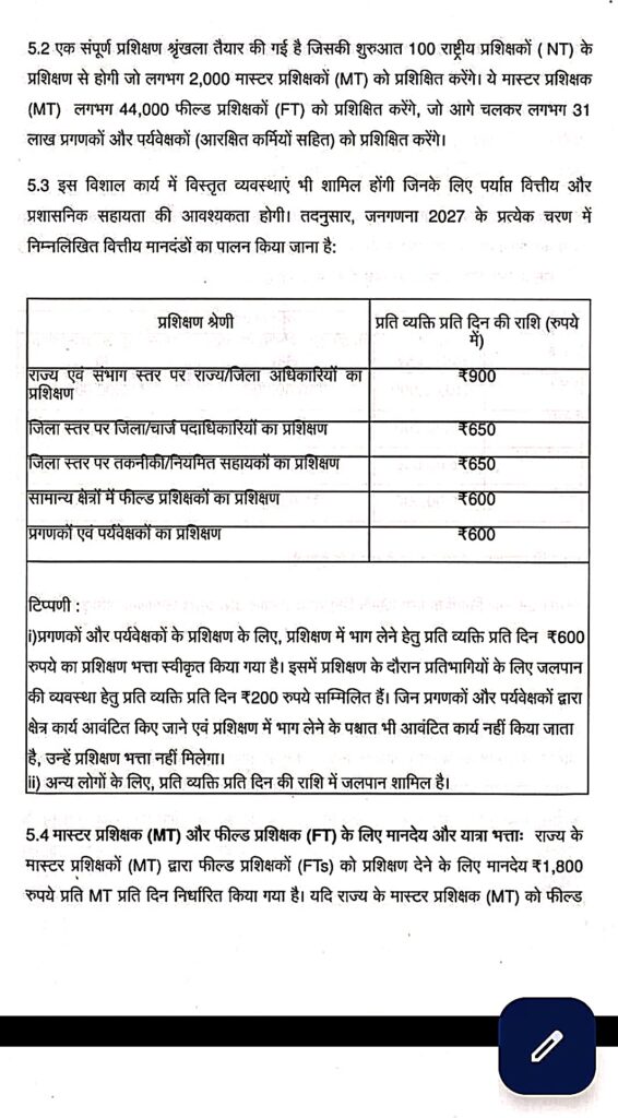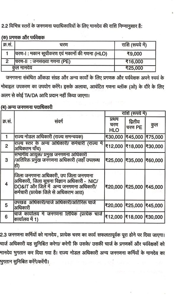 यह मानदेय फील्ड वर्क की प्रकृति और दूरी के अनुसार बदल सकता है।प्रशिक्षण भत्ता: ट्रेनिंग के दौरान ₹600 प्रतिदिन मिलेंगे, जिसमें रिफ्रेशमेंट शामिल है।भुगतान प्रक्रिया: यह राशि डीबीटी (DBT) के माध्यम से सीधे बैंक खाते में आएगी।प्रक्रिया: डिजिटल जनगणना (मोबाइल ऐप के जरिए) होने के कारण मानदेय में बढ़ोतरी की गई है।नोट: जनगणना का कार्य मौजूदा सरकारी कर्मचारियों (शिक्षक, आंगनवाड़ी कार्यकर्ता आदि) के लिए अतिरिक्त जिम्मेदारी है, जिसके लिए यह मानदेय दिया जाता है।