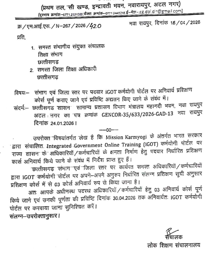 शिक्षकों के लिए लोक शिक्षण संचालनालय ने 16 अप्रैल को फिर से एक निर्देश जारी करके सभी संभागीय संयुक्त संचालक और जिला शिक्षा अधिकारी से कहा है कि शिक्षकों को Mission Karmyogi के अंतर्गत भारत सरकार द्वारा संचालित. ntegrated-.Government Online Training (iGOT) कर्नयोगी पॉर्टल पर राज्य शासन” के” अधिकारियों / कर्मचारियों के क्षनता निर्माण हेत पदवार निर्घारित प्रशिक्षण कार्स अनिवार्य किये जाने के संबंध नें निर्देश प्राप्त हए हैँ। छतीसगढ ‘ संमाग एवं जिला स्तर पर कार्यरत सनत्त अधिकारियों ‘ कर्मचारियों द्वारा iGOT कर्मयोगी पॉर्टल पर अपने-अपने अनुरुप निर्धारित संलग्न प्रिक्षण सूची अनुसार प्रशिक्षण कोर्स में से 03 कोर्स अनिवार्य रुप से किया जाना है। अतः आपके अधीनस्थ यदरथ अधिकारियों , कर्मचारियों हैंत् 03 अनिवार्य कोर्स’ पर्ण किये जाने एवं उनकी पूर्णता की प्रविष्टि दिनांक 30.04.2026 तक अनिवार्यत. iGOT कर्मयोगी पोर्टल पर करवाया जाना सुनिश्चित करने का निर्देश दिया गया है।