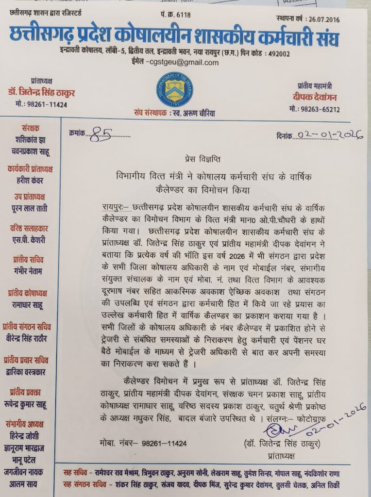 छत्तीसगढ़ प्रदेश कोषालय शासकीय कर्मचारी संघ के वार्षिक कैलेंडर का विमोचन विभाग के वित्त मंत्री माननीय ओ.पी. चौधरी के हाथों किया गया ।। छत्तीसगढ़ प्रदेश कोषालय शासकीय कर्मचारी संघ के प्रांतअध्यक्ष डॉ.जितेंद्र सिंह ठाकुर एवं प्रांतीय महामंत्री दीपक देवांगन ने बताया कि प्रत्येक वर्ष की भांति इस वर्ष 2026 में भी संगठन द्वारा प्रदेश के सभी जिला कोषालय अधिकारी के नाम एवं मोबाइल नंबर , पांचो संभाग के संभागीय संयुक्त संचालक के नाम एवं मोबाइल नंबर तथा वित्त विभाग के अति आवश्यक दूरभाष नंबर सहित आकस्मिक अवकाश, एच्छिक अवकाश तथा संगठन की उपलब्धि एवं संगठन द्वारा कर्मचारी हित में किये जा रहे हैं प्रयास का उल्लेख करते हुए कर्मचारी हित में वार्षिक कैलेंडर का प्रकाशन कराया गया है।। सभी जिलों के कोषालय अधिकारी के मोबाइल नंबर कैलेंडर में प्रकाशित होने से ट्रेजरी से संबंधित समस्याओं के निराकरण हेतु प्रदेश के कर्मचारी, अधिकारी एवं पेंशनर्स घर बैठे मोबाइल के माध्यम से ट्रेजरी अधिकारी से बात कर अपनी समस्या का निराकरण कर सकते हैं।