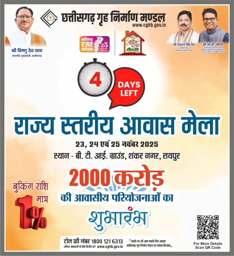छत्तीसगढ़ गृह निर्माण मंडल का यह राज्य स्तरीय आवास मेला प्रदेश की आवासीय विकास यात्रा में एक नया अध्याय जोड़ेगा। छत्तीसगढ़ स्थापना के रजत जयंती वर्ष में यह आयोजन “सबके लिए आवास” के लक्ष्य की दिशा में एक सार्थक और ऐतिहासिक पहल साबित होगा।