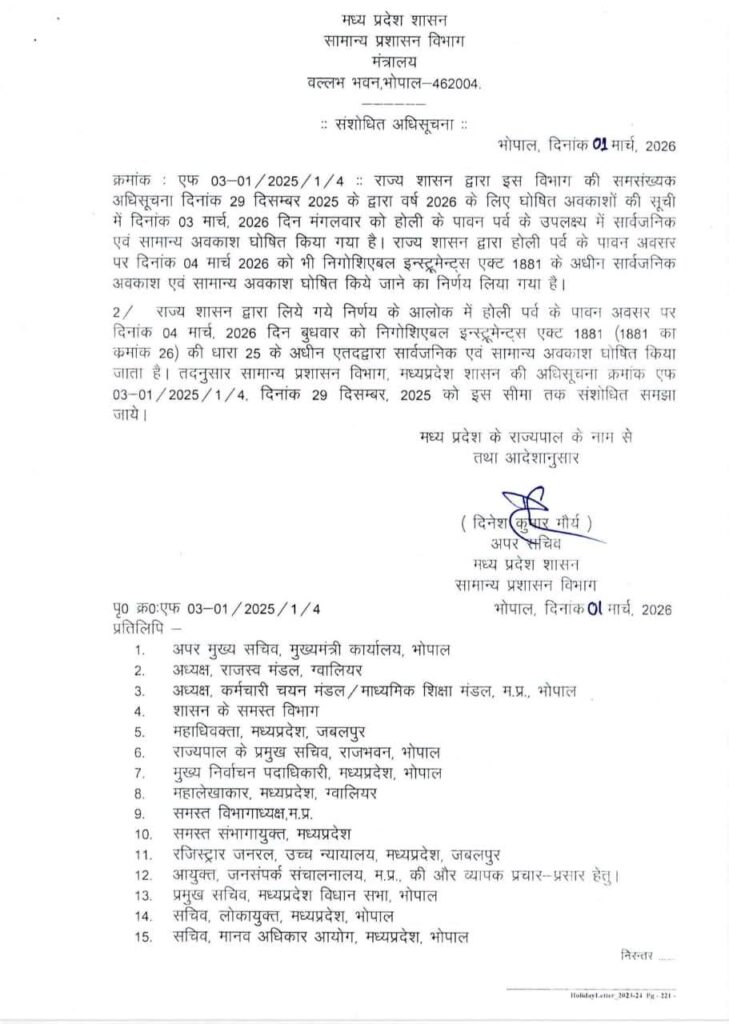 मप्र शासन ने इस बार होली पर्व पर दो दिन का अवकाश घोषित किया है। सामान्य प्रशासन विभाग द्वारा जारी आदेश के अनुसार अब 3 मार्च के साथ 4 मार्च को भी सार्वजनिक एवं सामान्य अवकाश रहेगा। इस आदेश के बाद प्रदेश में 3 और 4 मार्च को लगातार दो दिन तक सरकारी कार्यालयों, शैक्षणिक संस्थानों और बैंकिंग संस्थानों में अवकाश रहेगा। 2026 के लिए घोषित अवकाशों की सूची में 3 मार्च को होली पर सार्वजनिक एवं सामान्य अवकाश घोषित किया था।
