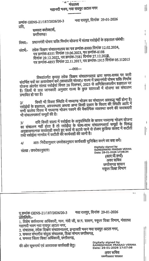 रसोइयों की हड़ताल से मिड डे मिल प्रभावित हुआ तो समूहों पर होगी कार्यवाही कलेक्टर को जारी निर्देश