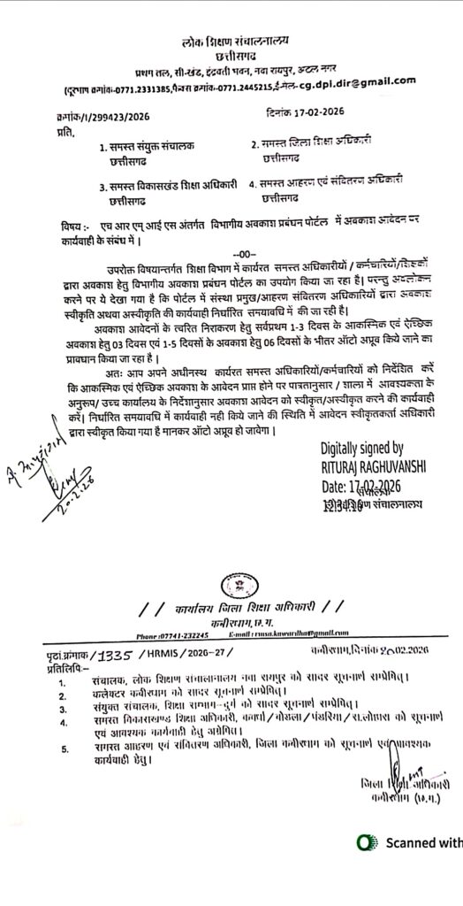 इस निर्देश के मुताबिक आकस्मिक एवं अर्जित अवकाश अवकाश आवेदनों के त्वरित निराकरण हेतु सर्वप्रथम 1-3 दिवस के आकस्िक एबं ऐच्छिक अवकाश हेतु ०3 दिवस एवं 1-5 दिवसों के अवकाश हेतु ०6 दिवसों के भीतर ऑटो अप्रूव किये जाने का प्रावधान किया गया है।