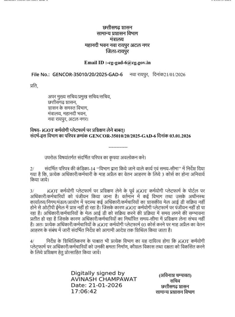IGOT पोर्टल में अधिकारी/ कर्मचारियों के द्वारा 3 कोर्स पूरा करना तो दूर हजारों कर्मचारियों ने पंजीयन भी नहीं किया है । सामान्य प्रशासन विभाग के सचिव अविनाश चंपावत के द्वारा निर्देश दिनांक 03.01.2026 के अनुसार