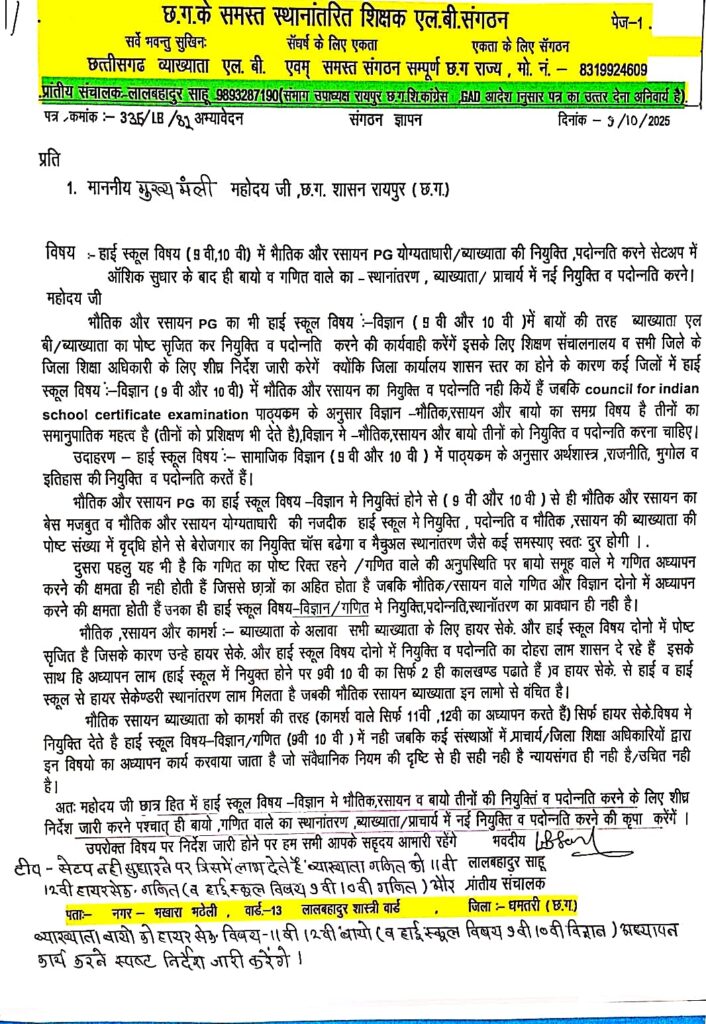 रायपुर – स्थानांतरित संगठन छ ग व्याख्याता एल बी एवं समस्त संगठन के प्रांत अध्यक्ष व छ ग शासन के मान्यता प्राप्त संगठन छत्तीसगढ़ शिक्षक कांग्रेस रायपुर संभाग के उपाध्यक्ष लालबहादुर साहू ने विज्ञान संकाय के शिक्षकों की समस्याओं को लेकर मुख्यमंत्री विष्णुदेव साय व संचालक लोक शिक्षण संचालनालय को लिखा पत्र छात्र हित व गुणवत्तापूर्ण शिक्षा हेतु मांग भी किये ।