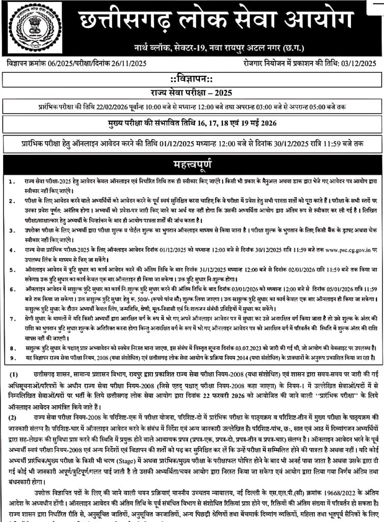 राज्य सेवा प्रारंभिक परीक्षा-2025 के लिए ऑनलाइन आवेदन दिनांक 01/12/2025 को मध्यान्ह 12:00 बजे से दिनांक 30/12/2025 रात्रि 11:59 बजे तक www.psc.cg.gov.in पर उपलब्ध लिंक के माध्यम से किए जा सकेंगे।