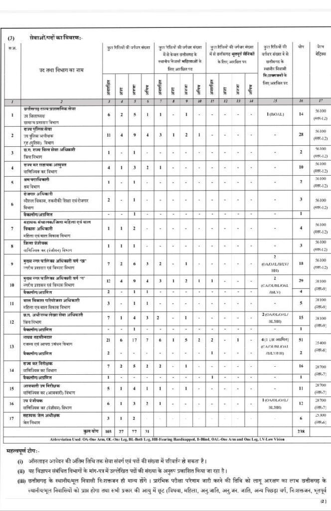 (1) छत्तीसगढ़ शासन, सामान्य प्रशासन विभाग, रायपुर द्वारा प्रकाशित राज्य सेवा परीक्षा नियम-2008 (यथा संशोधित) एवं शासन द्वारा समय-समय पर जारी की गई अधिसूचनाओं/परिपत्रों के अधीन राज्य सेवा परीक्षा नियम-2008 (जिसे एतद पश्चात् परीक्षा नियम-2008 कहा जाएगा) के नियम । में उल्लेखित सेवाओं/पदों में से निम्नलिखित सेवाओं/पदों पर भर्ती के लिये छत्तीसगढ़ लोक सेवा आयोग द्वारा दिनांक 22 फरवरी 2026 को आयोजित की जाने वाली “प्रारंभिक परीक्षा” के लिये ऑनलाइन आवेदन आमंत्रित किये जाते हैं।