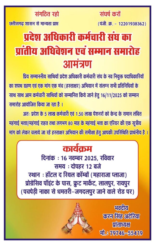 प्रदेश अधिकारी कर्मचारी संघ के नव नियुक्त पदाधिकारियों का शपथ ग्रहण एवं एक मांग एक मंच (हस्ताक्षर) अभियान में संलग्न सभी प्रतिनिधियों के साथ साथ आम कर्मचारी साथियों को सम्मानित किये जाने हेतु 16/11/2025 को सम्मान समारोह आयोजित किया गया है।