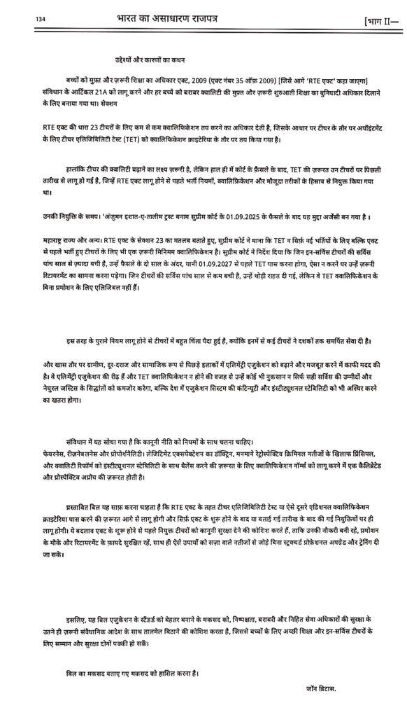 इसलिए, यह बिल एजुकेशन के स्टैंडरड को बेहतर बनाने के मकसद को, निष्पक्षता, बराबरी और निहित सेवा अधिकारों की सुरक्षा के उतने ही ज़रूरी संवैधानिक आदेश के साथ तालमेल बिठाने की कोशिश करता है, जिससे बच्चों के लिए अच्छी शिक्षा और इन-सर्विस टीचरों के लिए सम्मान और सुरक्षा दोनों पक्की हो सरकें।
