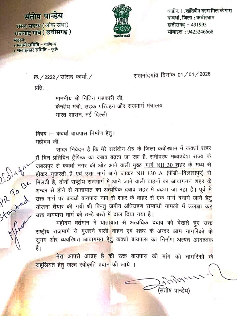 इस दौरान कवर्धा शहर में यातयात के बढ़ते दबाव के मद्देनजर कवर्धा बायपास के निर्माण एवं जिला कबीरधाम से चिल्फी घाटी से मध्यप्रदेश को जोड़ने वाली 125 किलोमीटर (धवईपानी से सिमगा तक) एक लेन सड़क को फोरलेन सड़क में उन्नयन किये जाने हेतु निवेदन कर पत्र दिया।