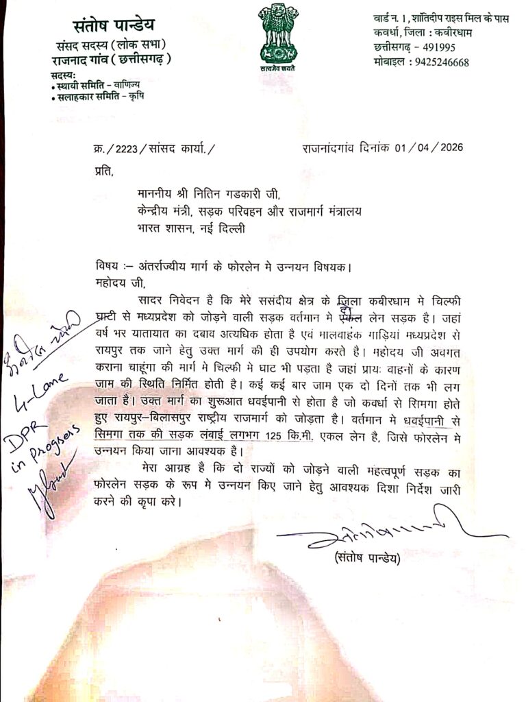 कवर्धा बायपास के निर्माण और धवईपानी चिल्पीघाटी से सिमगा तक 125 किलोमीटर तक एक लेन सड़क का फोरलेन में उन्नयन को लेकर मांग पत्र सौंपा