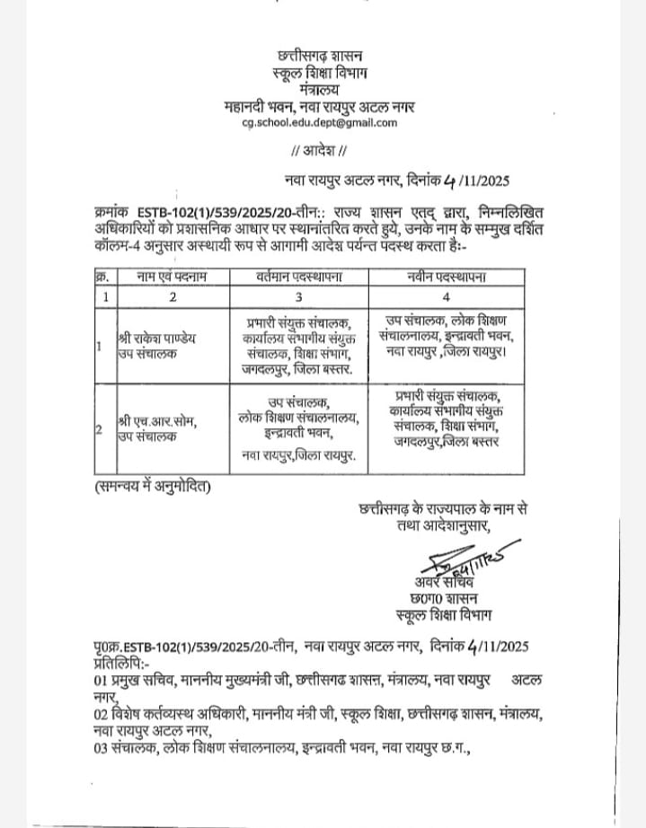 क्रमांक ESTB-102(1)/539/2025/20-तीनःः राज्य शासन एतद् द्वारा, निम्नलिखित अधिकारियों को प्रशासनिक आधार पर स्थानांतत्रित करते हुये, उनके नाम के