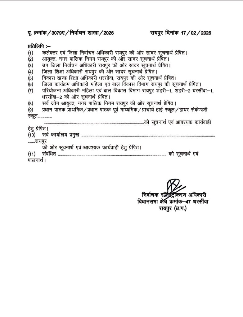 रायपुर जिले में लगभग डेढ़ महीने से एस आई आर लगे शिक्षकों को जिला निर्वाचन रजिस्ट्रीकरण अधिकारी ने आदेश जारी करते हुए आज से स्कूल के लिए तत्काल कार्यमुक्त करने का निर्देश दिया है।