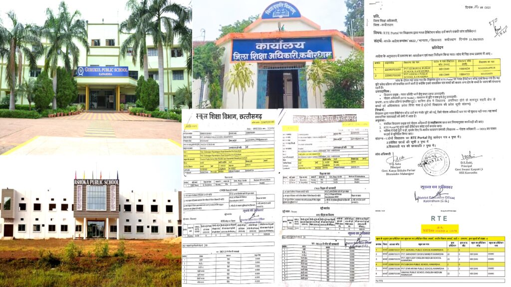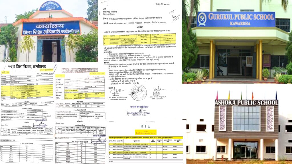 निःशुल्क एवं अनिवार्य बाल शिक्षा अधिकार अधिनियम आरटीई के अंतर्गत शैक्षणिक सत्र 2025–26 में कबीरधाम जिले के निजी विद्यालय गुरूकुल पब्लिक स्कूल महाराजपुर एवं अशोका पब्लिक स्कूल शिक्षक नगर में द्वारा नोडल अधिकारियों एवं तत्कालीन जिला शिक्षा अधिकारी के साथ मिलीभगत कर गलत मैपिंग के माध्यम से प्रवेश प्रक्रिया में हेरफेर करनी की शिकायत युवा कांग्रेस प्रदेश सचिव आकाश केशरवानी एवं युवा कार्यकर्ताओ द्व्रारा जिला शिक्षा अधिकारी कबीरधाम को 19 अगस्त 2025 को किया गया था ।
