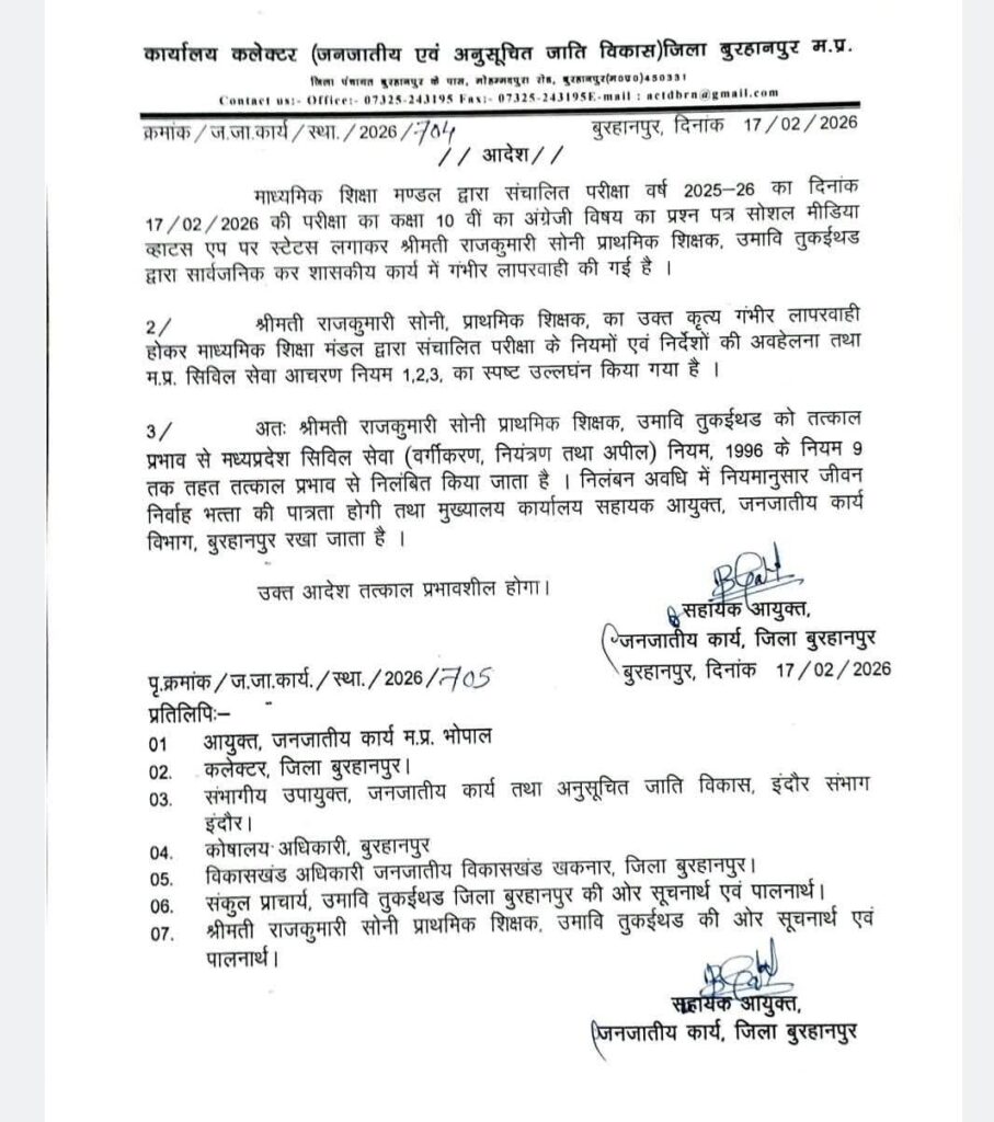 कक्षा 10 वीं की बोर्ड परीक्षा ड्यूटी में तैनात शिक्षिका ने परीक्षा के दौरान प्रश्न पत्र को ही वाट्सअप स्टेट्स पर लगा दिया हुई सस्पेंड