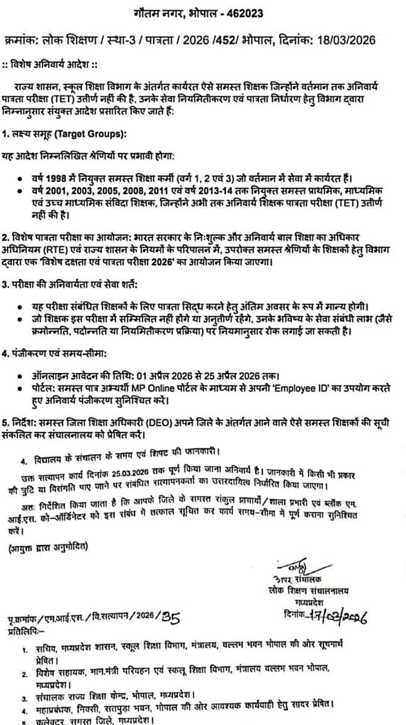 गौतम नगर, भोपाल के निर्देश क्रमांकः लोक शिक्षण / स्था-3 / पात्रता / 2026 /452/ भोपाल, दिनांक:18/03/2026 के अनुसार राज्य शासन, स्कूल शिक्षा विभाग के अंतर्गत कार्यरत ऐसे समस्त शिक्षक जिन्होंने वर्तमान तक अनिवार्य पात्रता परीक्षा (TET) उत्तीर्ण नहीं की है, उनके सेवा नियमितीकरण एवं पात्रता निर्धारण हेतु विभाग द्वारा निम्नानुसार संयुक्त आदेश प्रसारित किया है जिसके अनुसार